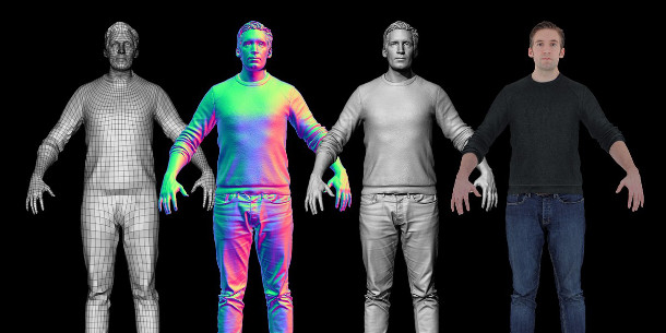 The figure (fun factoid: the actor is Ten24 director James Busby) is available both as raw scan geometry, decimated to 15 million polygons; and as lower-res versions cleaned up and retopologised for animation.