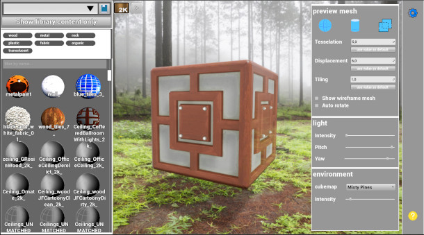 Materials are displayed with user-customisable 3D previews, displayed on a set of simple geometry primitives. The previews support displacement, plus the option to change the light angle.
