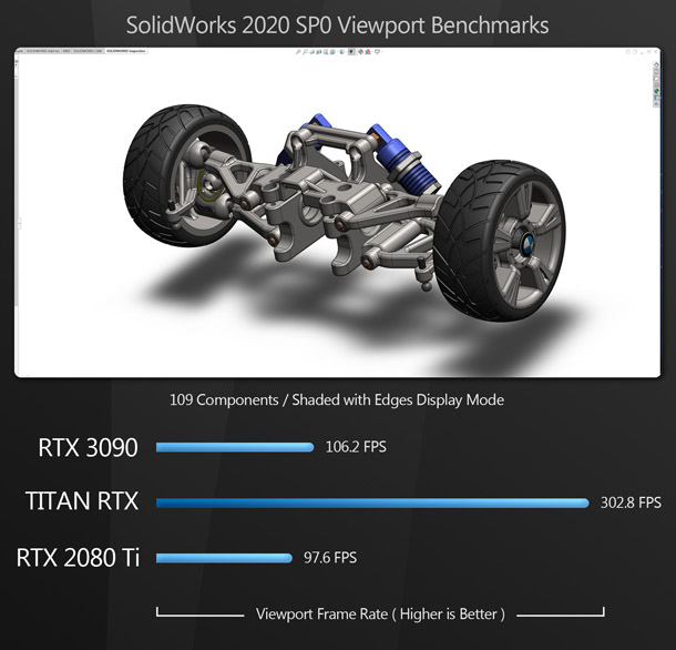 The GeForce RTX 3090 takes first place in all of the viewport tests except one – the single anomaly being the SolidWorks test, in which the previous-generation Titan RTX has a substantial lead. This may be due to the fact that the Titan’s drivers enable features otherwise only available in Nvidia’s professional GPUs, although my tests suggest that for most applications, there is little difference in performance between Nvidia’s Studio and Game Ready drivers: something discussed in more detail later in this article.