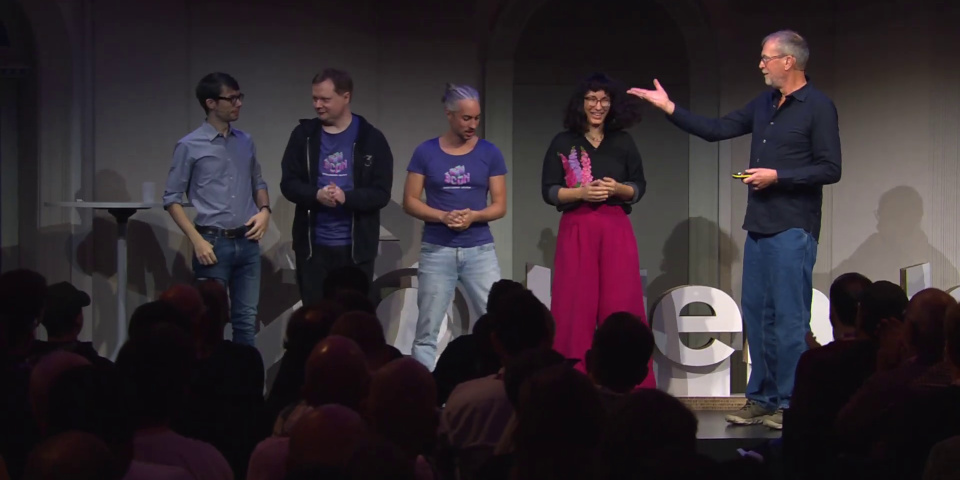 Roosendaal (right) introduces the new Blender leadership team: (L-R) incoming CEO Francesco Siddi, Sergey Sharybin, Dalai Felinto and Fiona Cohen.