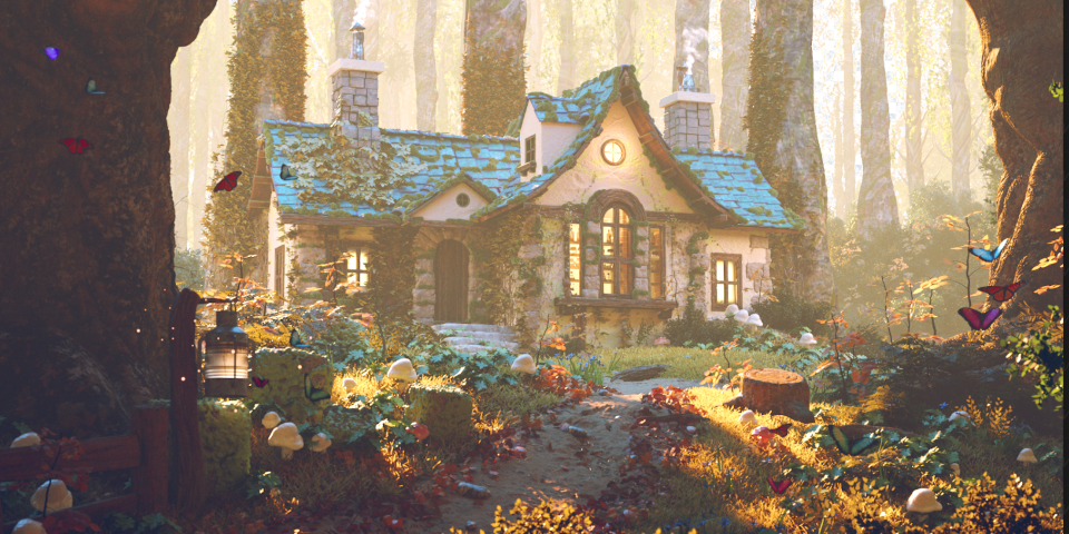 A forest scene rendered using V-Ray GPU running on an AMD Radeon GPU.