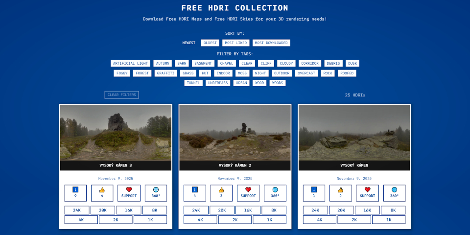 At the time of writing, there are 25 HDRIs available, mainly natural and urban exterior environments, but new files are being added steadily.
