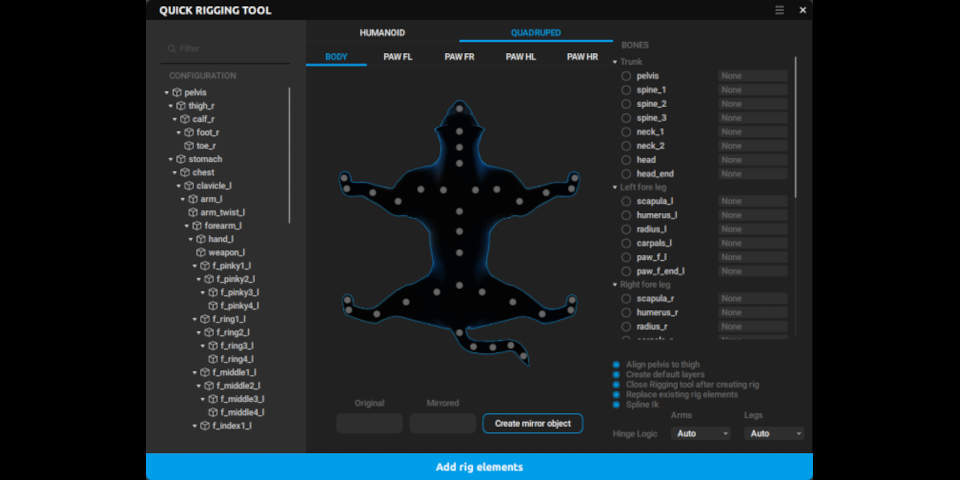 The Quick Rigging tool gets a new Quadruped tab for rigging four-legged creatures, shown in the image above.