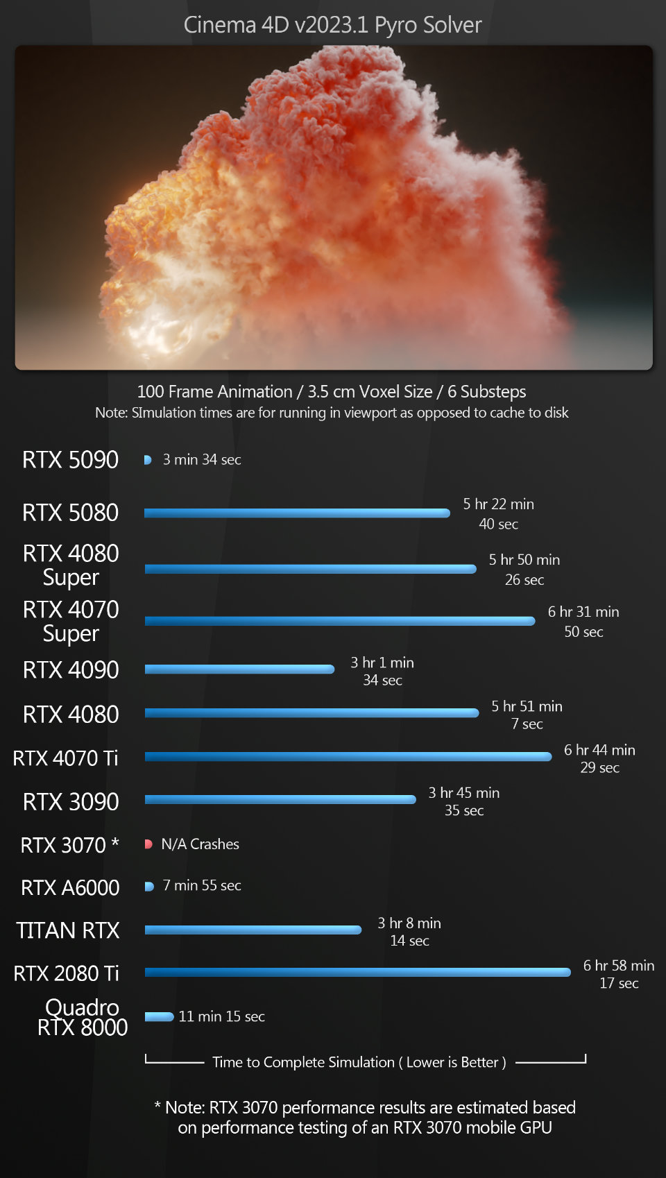 The Cinema 4D Pyro test is another illustration of the benefit of additional graphics memory for complex CG work. The simulation tops out at around 30 GB, slowing to a crawl once GPU memory is exhausted, so only the GeForce RTX 5090 and the older GeForce RTX A6000 and Quadro RTX 8000 offer performance that would be considered usable in production.