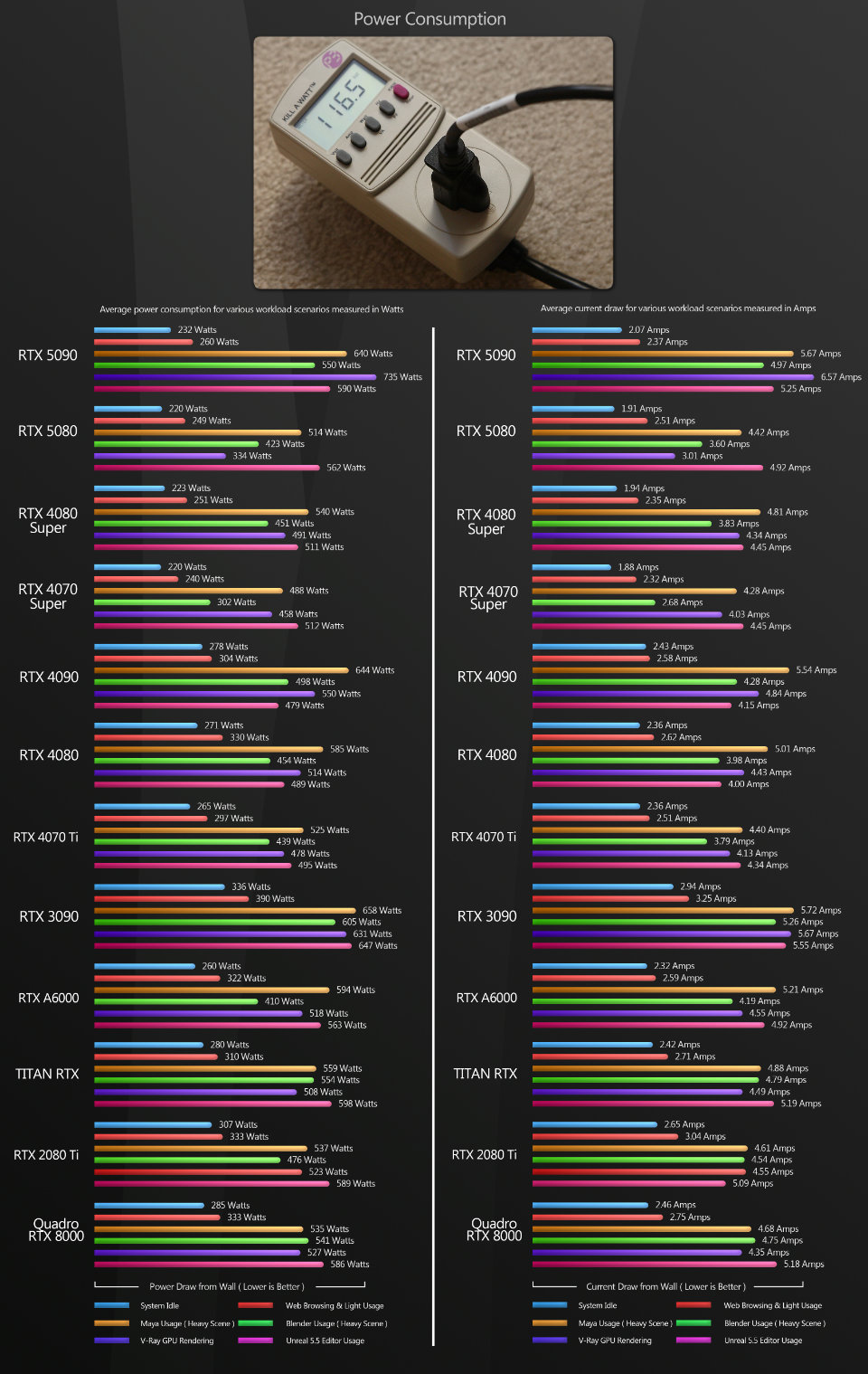 To test the power usage of the GPUs, I measured the power consumption of the entire test system at the wall outlet, using a P3 Kill A Watt meter. Since the test machine is a power-hungry Threadripper system, my figures will be higher than most DCC workstations.