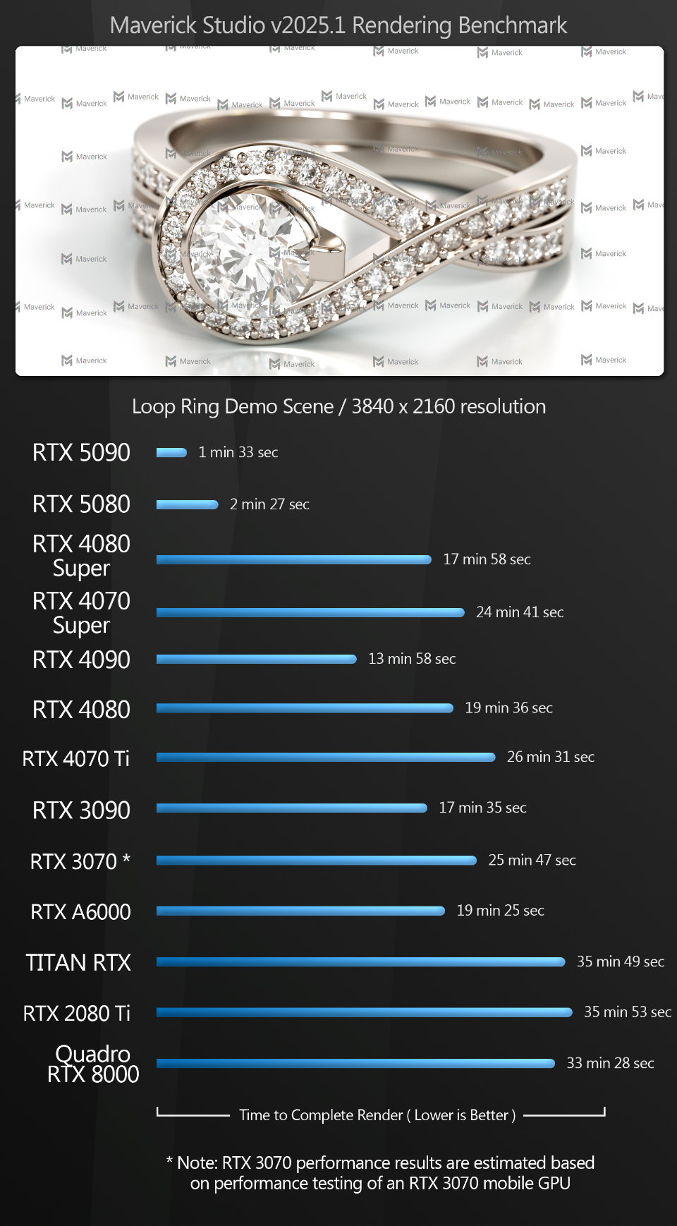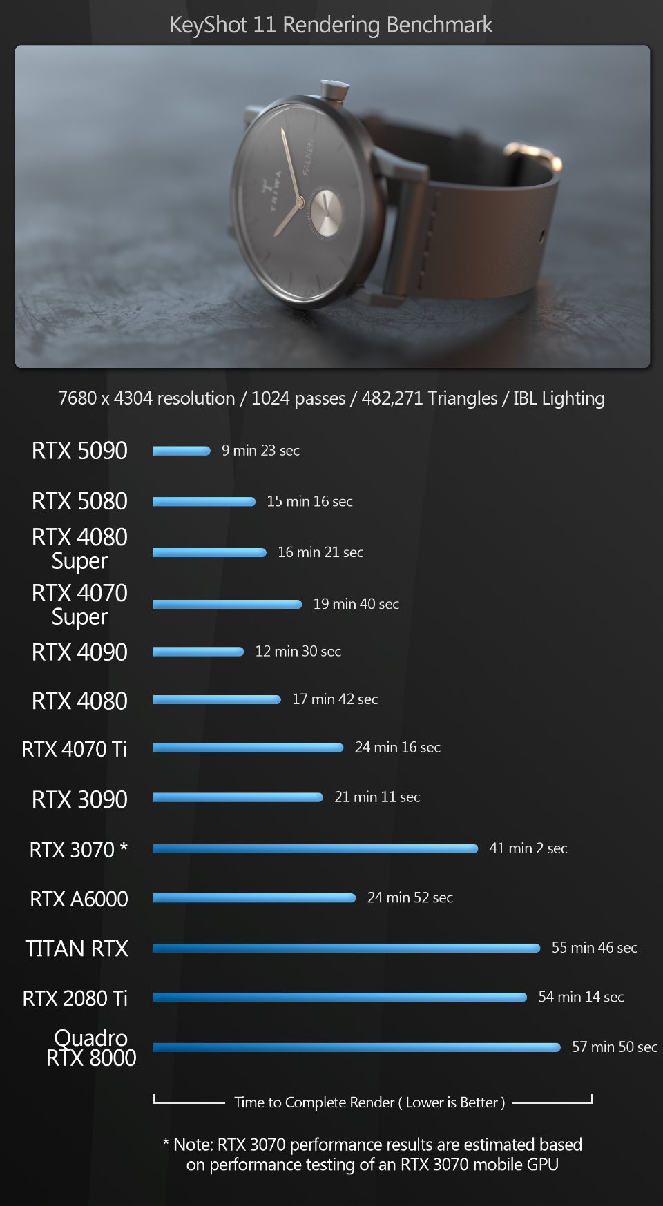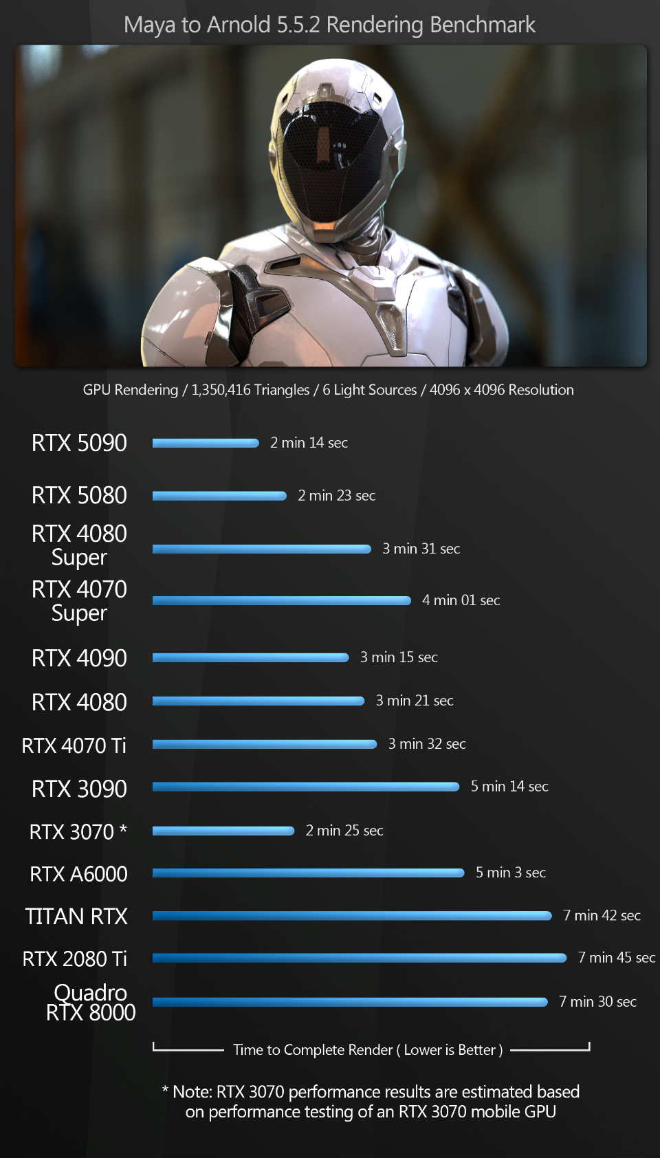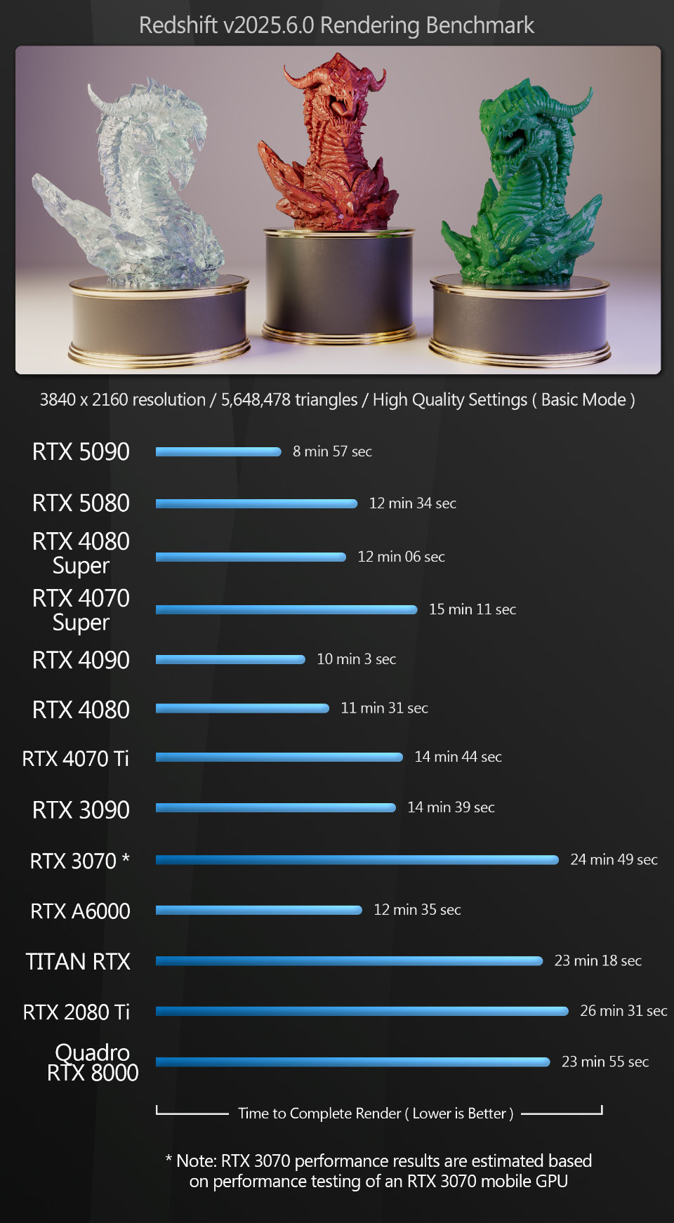Next, we have a set of GPU rendering benchmarks, performed with an assortment of the more popular GPU renderers, rendering single frames at 4K or higher resolutions.
