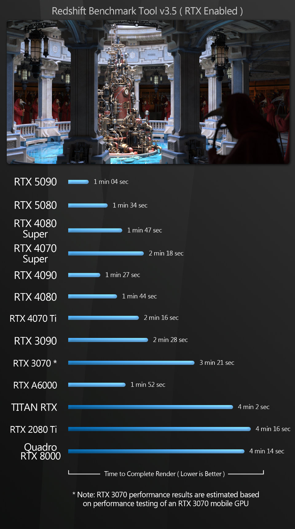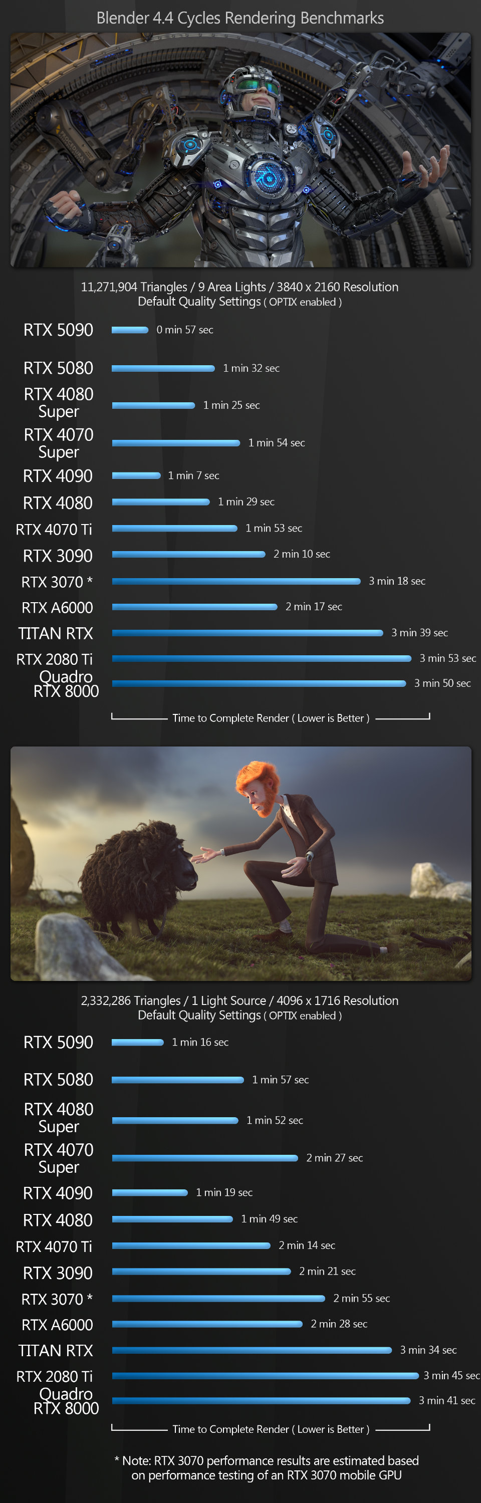 Blender Blender is the first test where the new Blackwell GPUs really shine across the different view modes. The GeForce RTX 5090 takes the top spot with the Eevee renderer by a very large margin, losing out only to the GeForce RTX 4090 in wireframe mode.