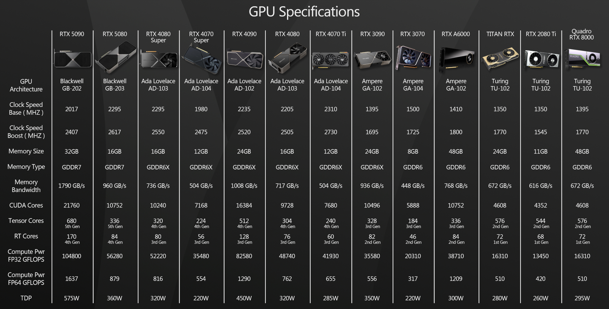 Next, let’s take a look at the technical specifications for the new GPUs. You can find deep dives into the Blackwell GPU architecture on mainstream tech news sites, so I’ll be focusing on the specs most relevant to the performance of CG software here.