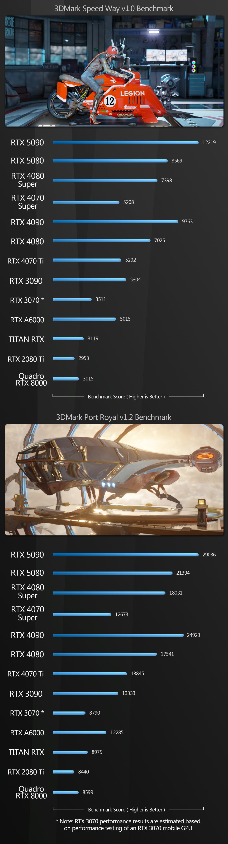 3DMark Speed Way 1.0 and Port Royal 1.2, OctaneBench 2025.2.1, Redshift Benchmark 3.5, Unity Enemies Demo, V-Ray Benchmark 6.00.02