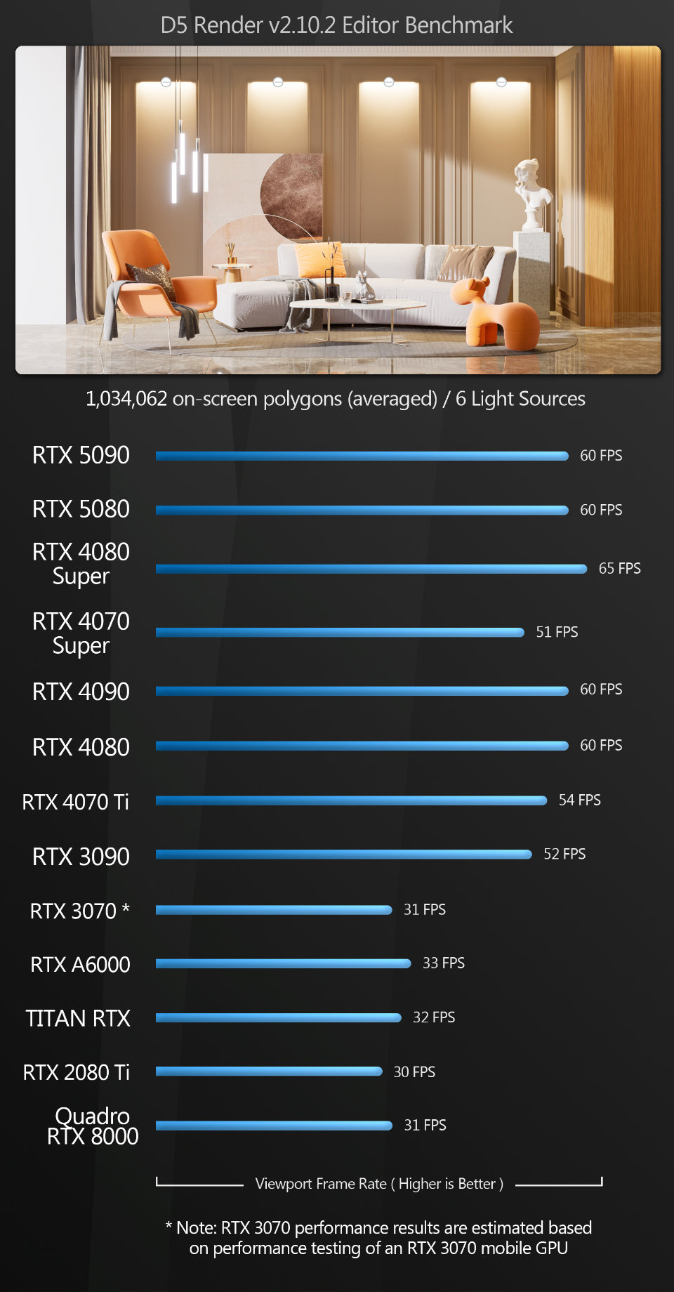 D5 Render The D5 Render benchmark generates some strange results, although both of the new Blackwell GPUs perform well.