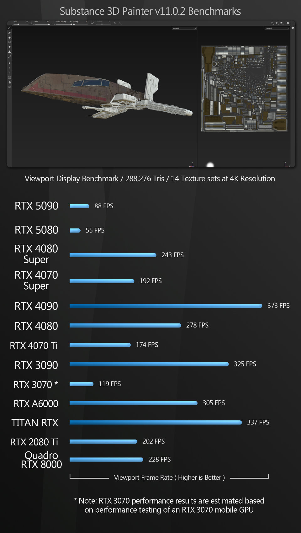 Substance 3D Painter Painter is another application that yielded very unexpected results. Viewport frame rate is significantly lower for the new Blackwell GPUs than all of the other GPUs on test. Even the seven-year-old GeForce RTX 2080 Ti easily beats the 5080 and 5080.
