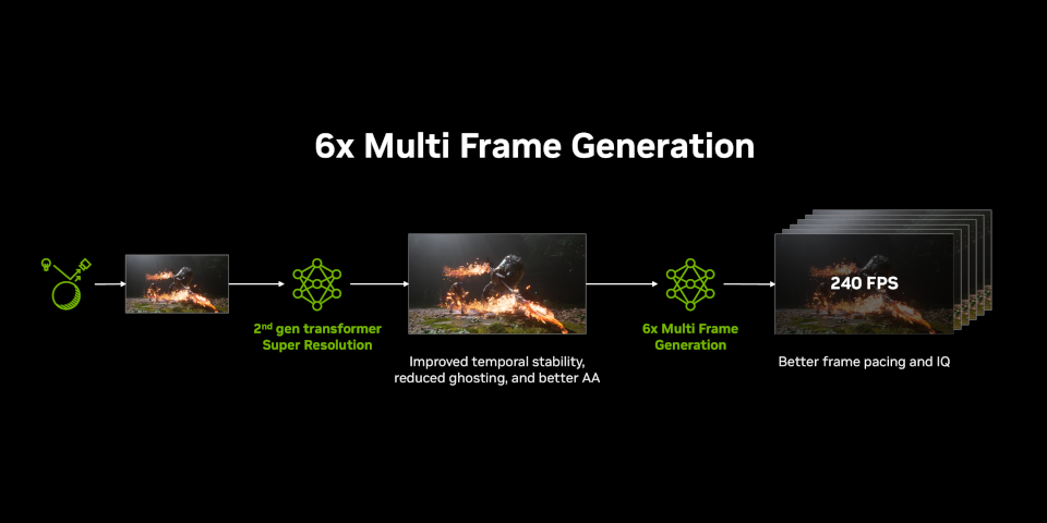 Multi Frame Generation gets a new 6X mode, making it possible to generate up to five additional frames for each natively rendered one, up from three in the original version in DLSS 4.