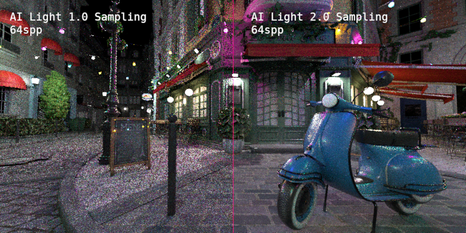 It now incorporates “full spatial and directional information” for all emissive primitives, reducing noise for a given sample count: you can see a side-by-side comparison above.