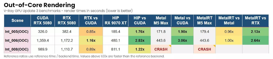 According to Chaos’s blog post, out-of-core rendering – rendering scenes larger than will fit into GPU memory – is “where the AMD story becomes especially interesting”.