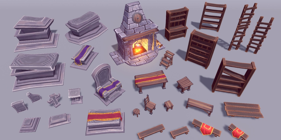 The Fantastic – Dungeon Pack contains 3D assets for creating a stylized dungeon, including modular architectural parts, furniture, crates, and props like potions, books and candles.