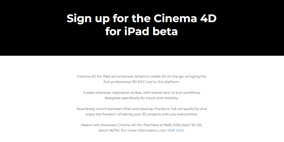 Maxon will be demoing the beta of Cinema 4D for iPad at next week’s NAB 2026 show: you can register for the beta once it becomes available via the link at the foot of the story.