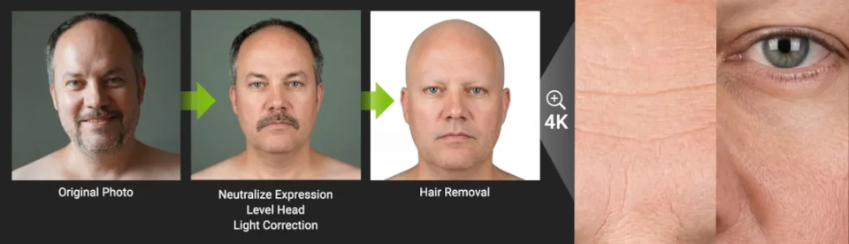 That includes fixing a lot of issues that make it difficult to use reference photos for head generation, like the subject not facing the camera, or not having a neutral facial expression.