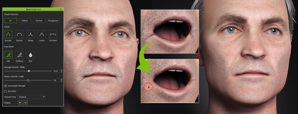 A new Blend Mask system controls where the textures are applied to the head, making it possible to mask out unwanted elements from the source image, like scars or blemishes, using the new Mask Brush Tool.